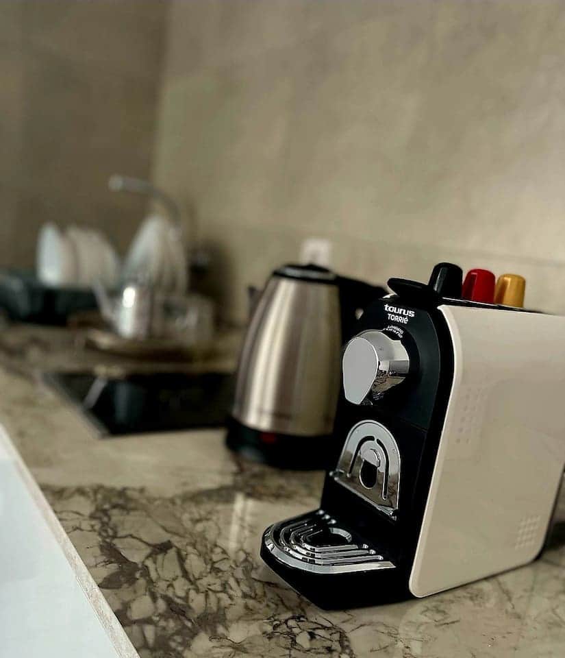 Coffee machine, Cooking utensils, Kitchen stove, Kitchenette, Refrigerator